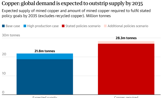 Pero afirmó que si los gobiernos actuaran con rapidez, podrían reducir el déficit previsto. «[Una escasez de suministro] no es inevitable. Podemos mitigarla si actuamos con rapidez, lanzando nuevos proyectos al mercado con rapidez, reciclando el cobre y sustituyéndolo por otros metales como el aluminio, para paliar el problema».