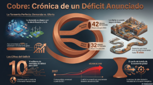 La economía mundial se encamina hacia una escasez estructural de cobre de una magnitud sin precedentes. Las proyecciones apuntan a un déficit acumulado cercano a los 10 millones de toneladas en 2040, equivalente a aproximadamente un tercio de la demanda global actual. Este desequilibrio no es coyuntural ni fácilmente corregible: responde a una combinación de demanda estructuralmente creciente y una oferta incapaz de reaccionar con la velocidad necesaria.